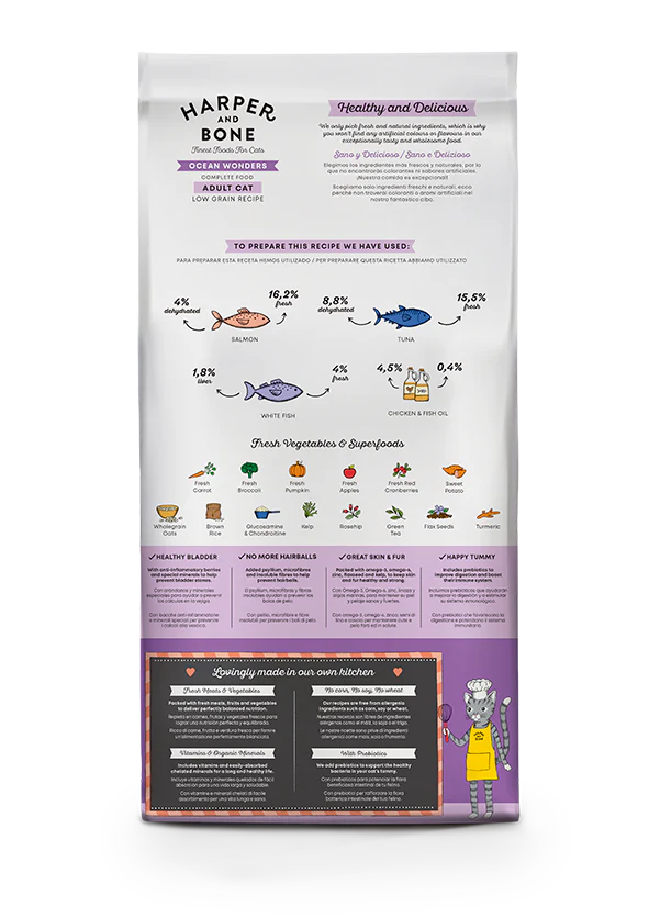 Rijstproteïne, gedroogde zoete aardappel 1,8%, gehydrolyseerde vis 1,8%, aardappelproteïne, volkoren haver 1,3%, lijnzaad (natuurlijke bron van omega-3 vetzuren)